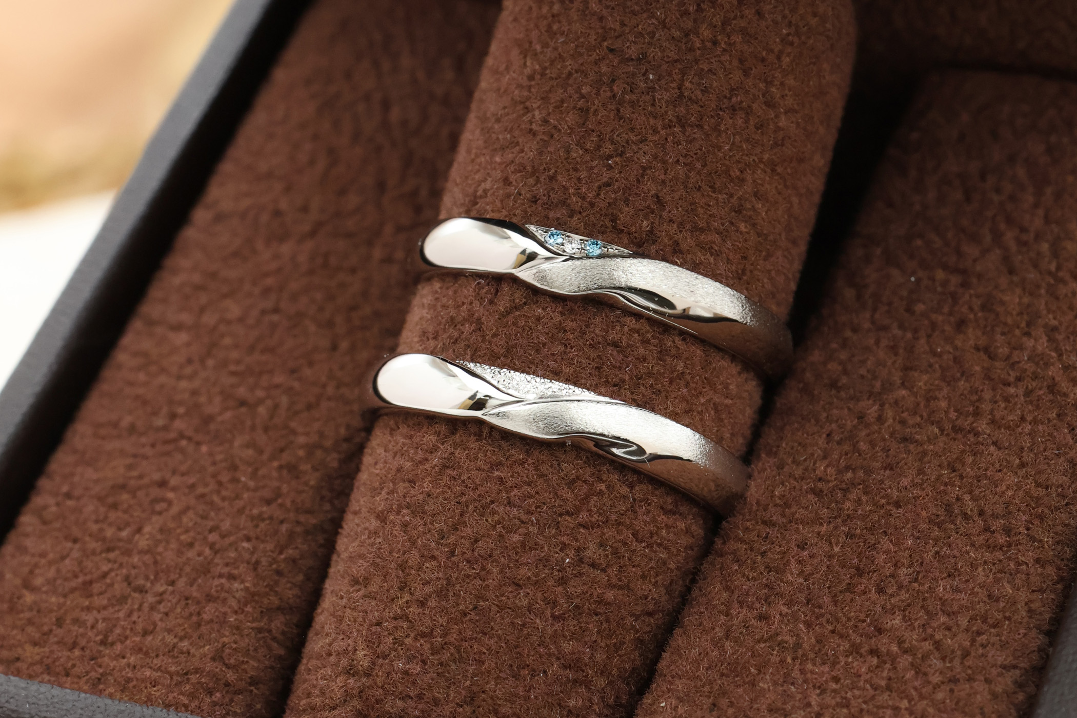 左右で表情を変えたアシンメトリーの結婚指輪です。中央でさりげなく入れたひねりから顔をのぞかせているのはホワイトとアイスブルーのダイヤモンド。男性にはスターダスト加工を施しました。サイドに入れたダイヤモンドポリッシュのツヤ消し加工もいい雰囲気