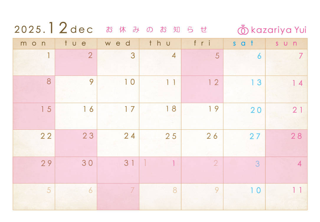2025.12結婚指輪,婚約指輪,福島,郡山,オーダーメイド,手作り,お休み